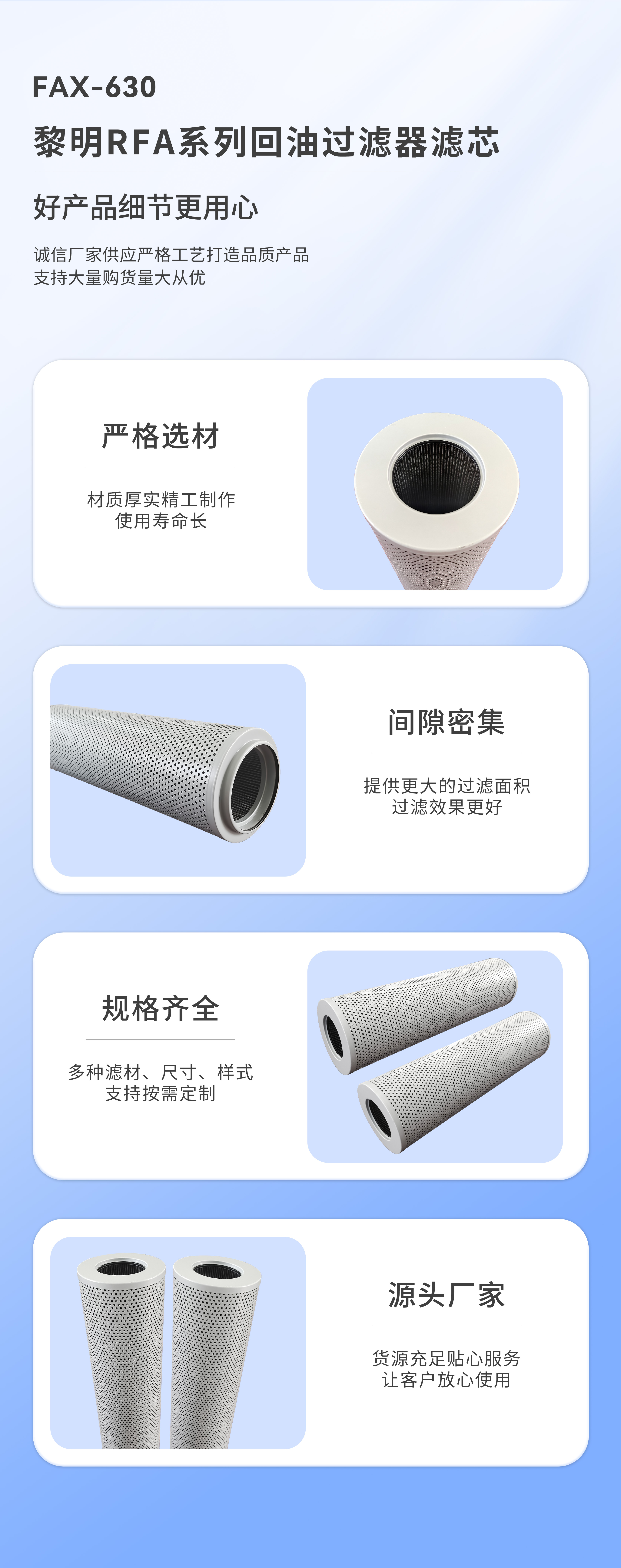 濾芯精度的高低、結構尺寸的確定是由其過濾時的流量和過濾介質的特性所決定的。濾芯的濾材均為國產/進口玻纖或不銹鋼濾網組成,結構合理,波紋整列均勻,流量大,受阻力小。