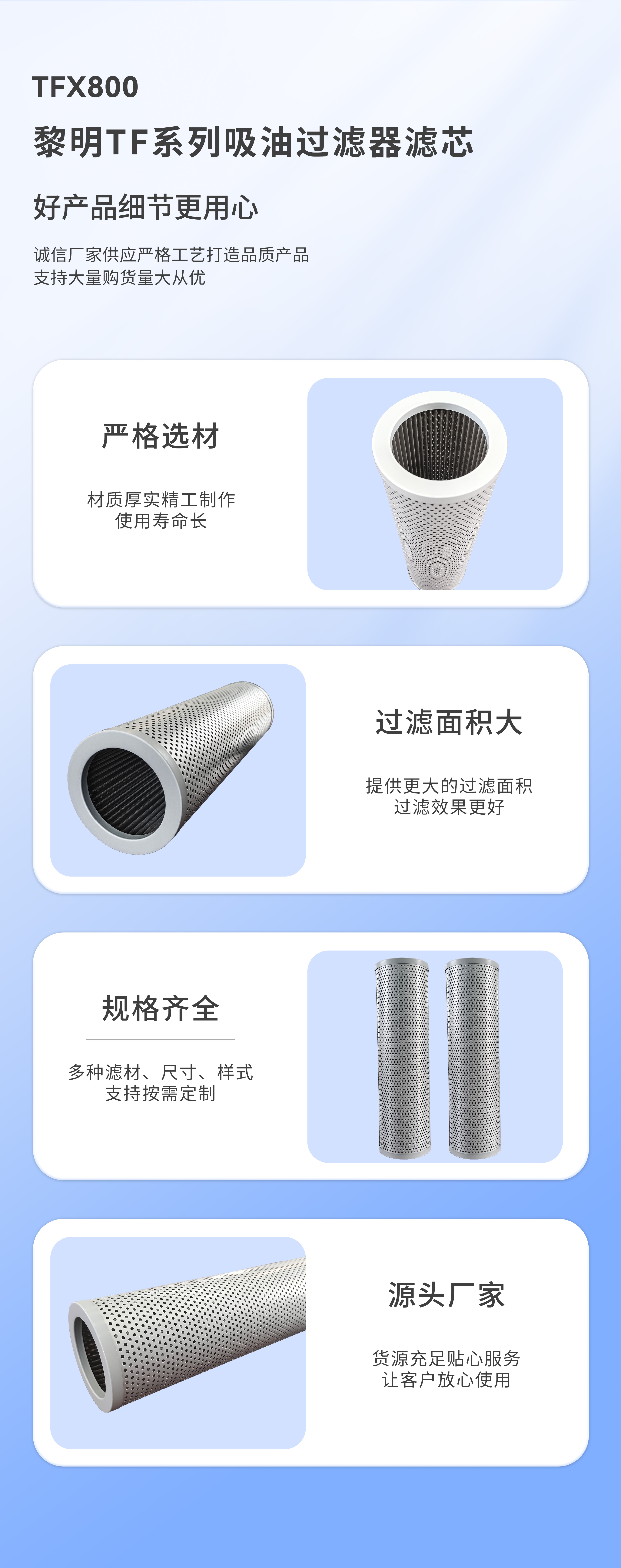 【產品簡介】:液壓油濾芯是輸送介質的管道系列中不可缺少的部分,通常安裝在液壓系統的進口端過濾中用來濾除流體介質中的金屬顆粒,污染雜質,用于保護機器設備的正常運行工作。流量:800L / min 精度:80、100、180微米可選。