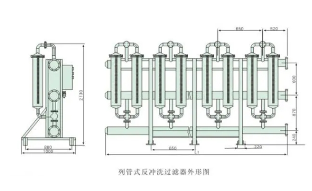 列管式反沖洗過濾器由罐體、濾芯組件、設備就近連接管線、自動閥門、控制柜等組成。在過濾器殼體的內部設置有多根濾管,污液從濾管外面流向濾管內部,然后從過濾器的集液腔流出。控制采用壓差/時間控制(壓差優先),當過濾器進出口的壓差達到設定的壓差極限時,過濾器進入反向沖洗過程。需進行反沖洗的濾管單元中止過濾,進行反沖洗。可供選擇濾芯種類:金屬燒結濾芯、楔形濾芯、絲網濾芯、聚丙烯濾芯、陶瓷濾芯。