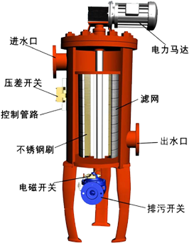 采用機電一體化設計。全自動自清洗過濾器由驅動機構、控制管路(包括壓差開關)、主管組件、濾芯組件、清洗機構、連接法蘭等主要零部件組成。 電控器、控制管路和排污閥構成過濾器的控制部分,用于實現自動清洗排污過程。 控制管路由壓差開關、管接頭、黃銅管等附件組成。過濾器常規產品使用不銹鋼轉刷,也可根據不同的使用條件(水溫、水質),選用其它材質的轉刷。